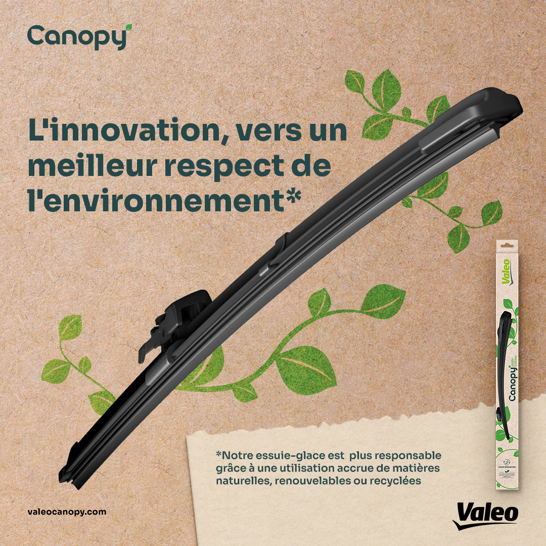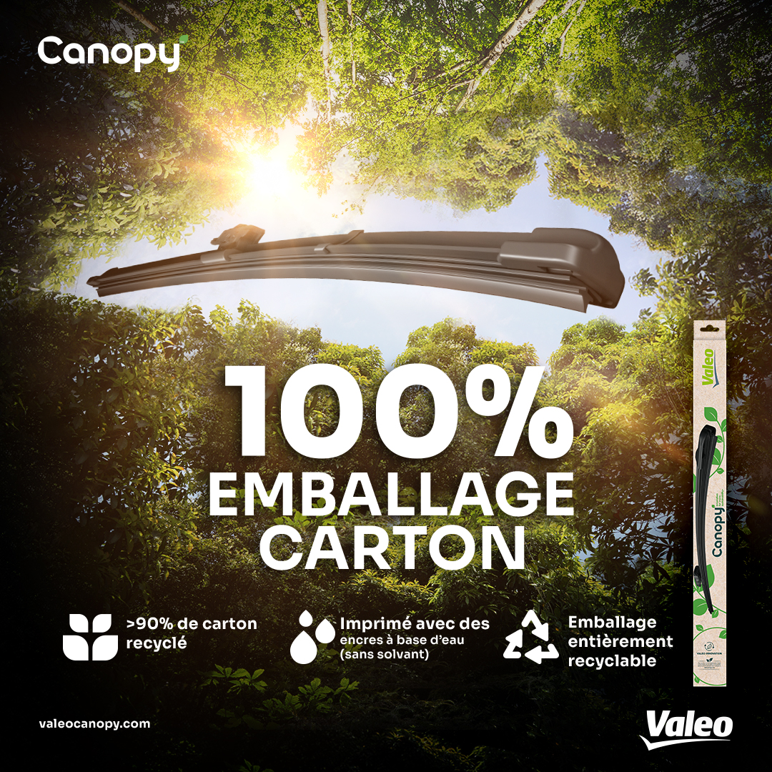Leur structure est composée jusqu’à 15% d’acier recyclé et leurs embouts jusqu'à 50% de plastique recyclé. De plus, leur emballage 100% carton est entièrement recyclable et imprimé avec des encres à base d’eau sans solvant. Les essuie-glaces Valeo Canopy™ sont produits et emballés en France dans une usine certifiée ISO 50001.